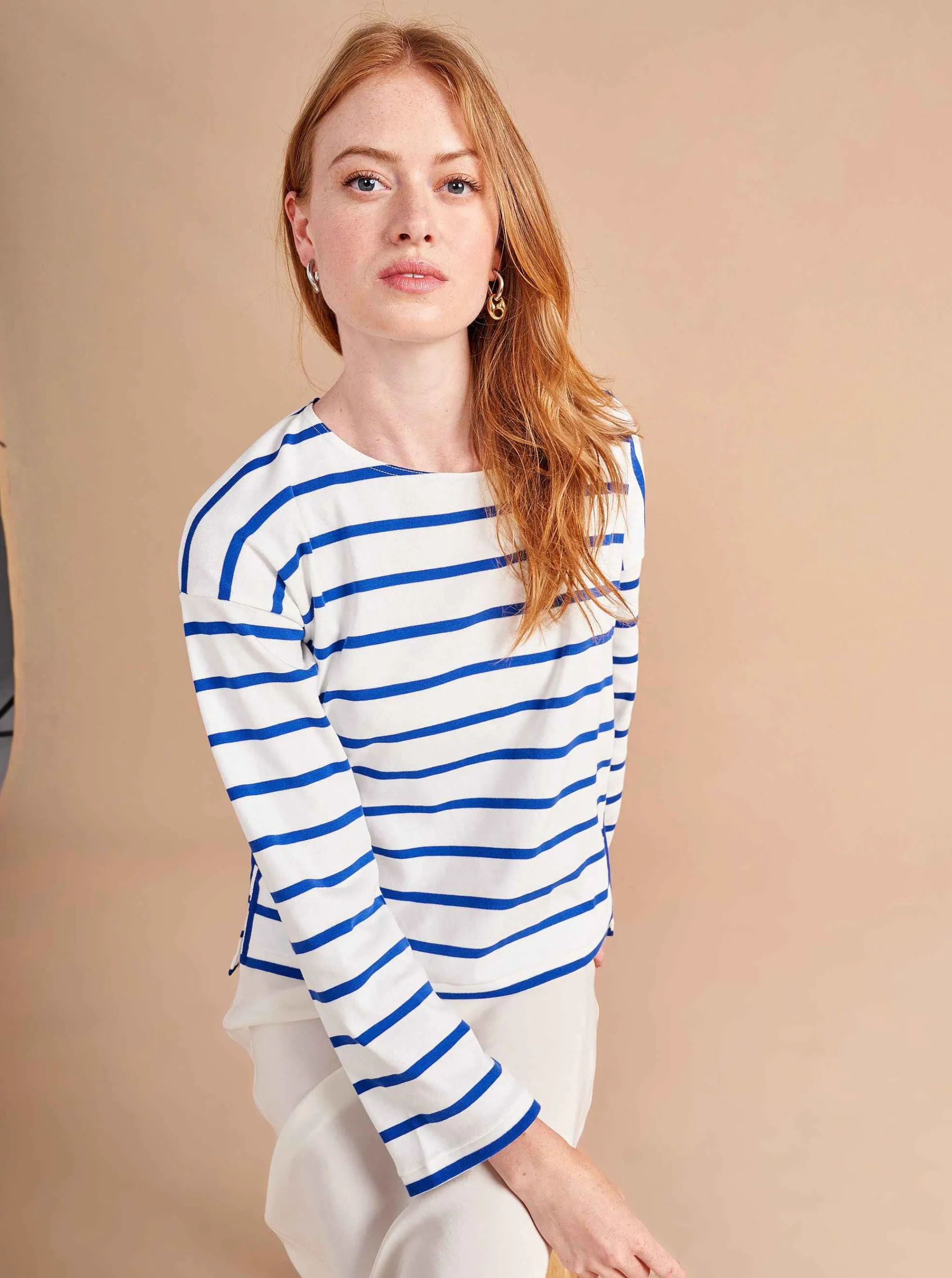 The Epitome Of Quintessential Breton Style, This Long Sleeve Tee Does It All In 100% Super Soft Ivory Cotton With Cobalt Stripes.